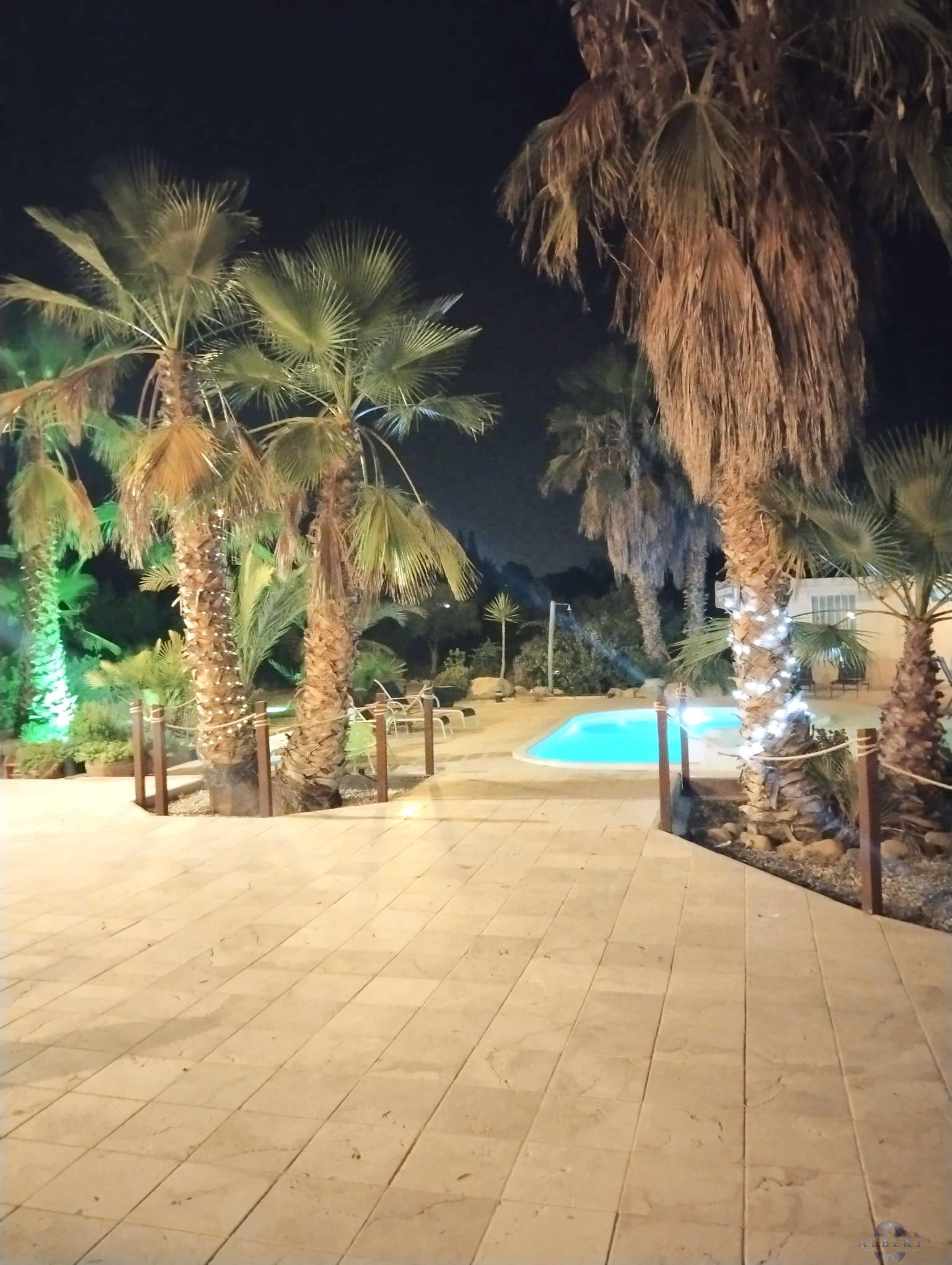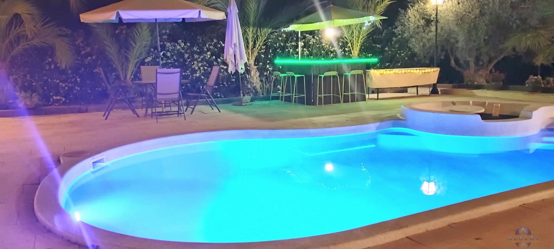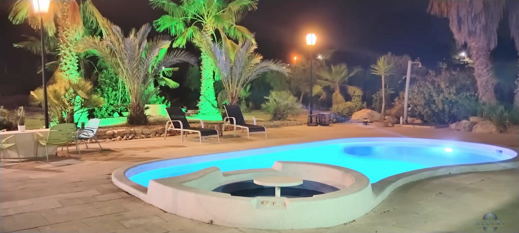 area, pool with Jacuzzi, and night lighting. Water treatment plant, outdoor