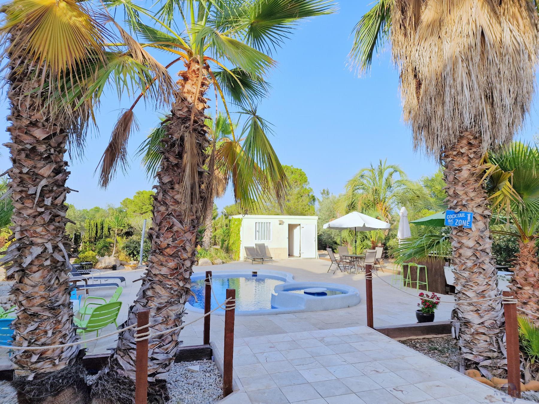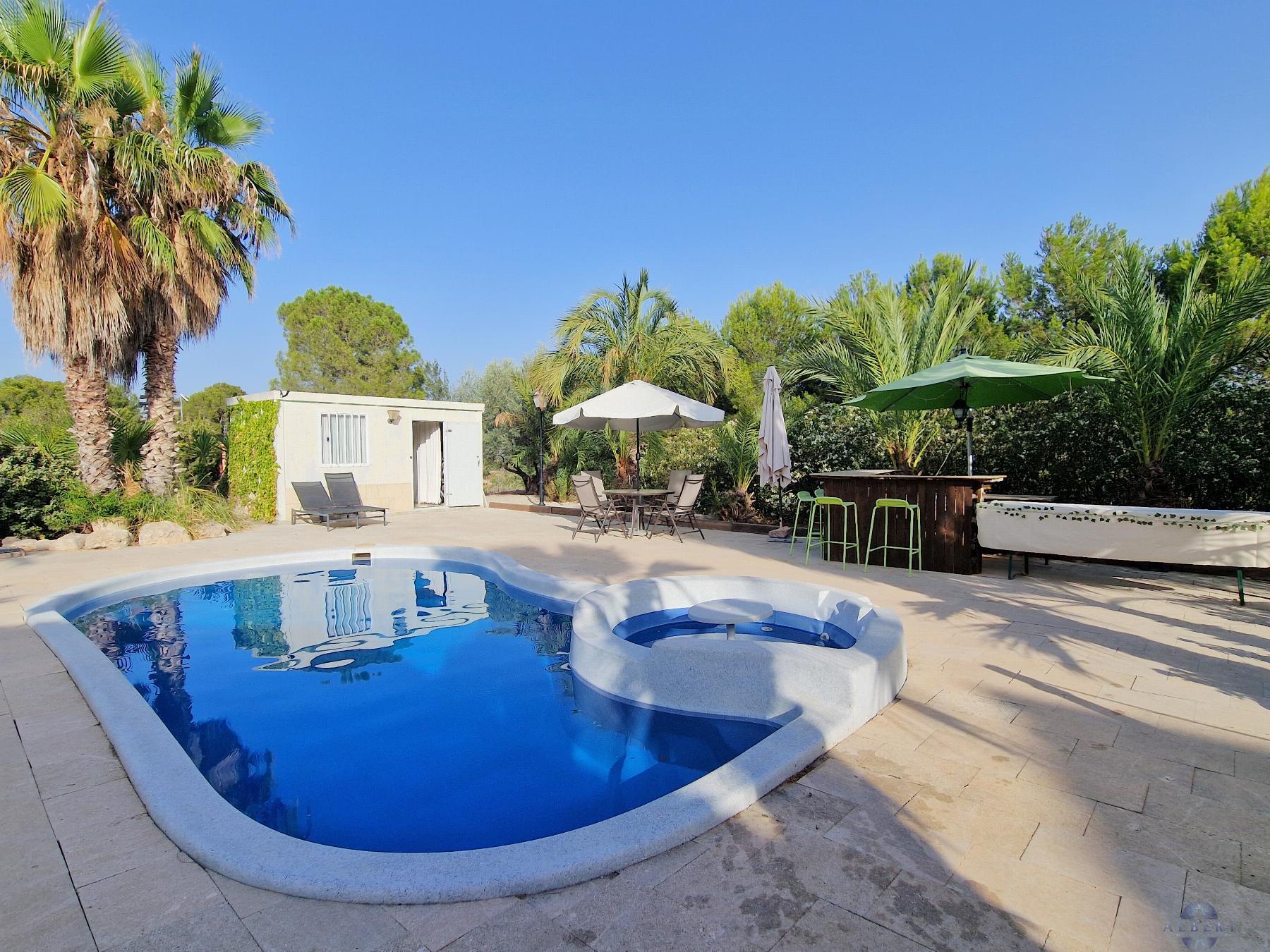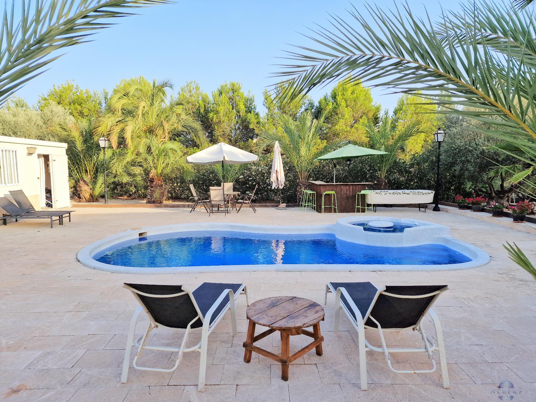 area, pool with Jacuzzi, and night lighting. Water treatment plant, outdoor